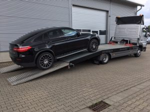 Unser Abschleppwagen auf den ein Mercedes GLE Coupe gefahren wird.
