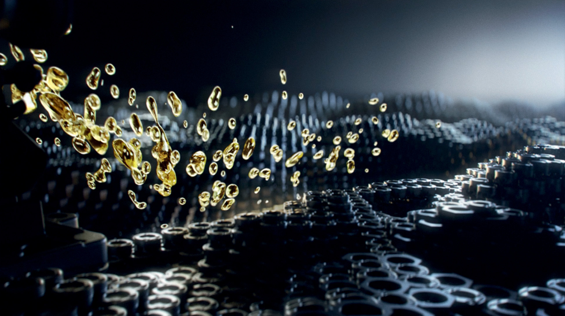 die Grafik zeigt Öltropfen die über einer Landschaft aus Schraubenmuttern schweben.