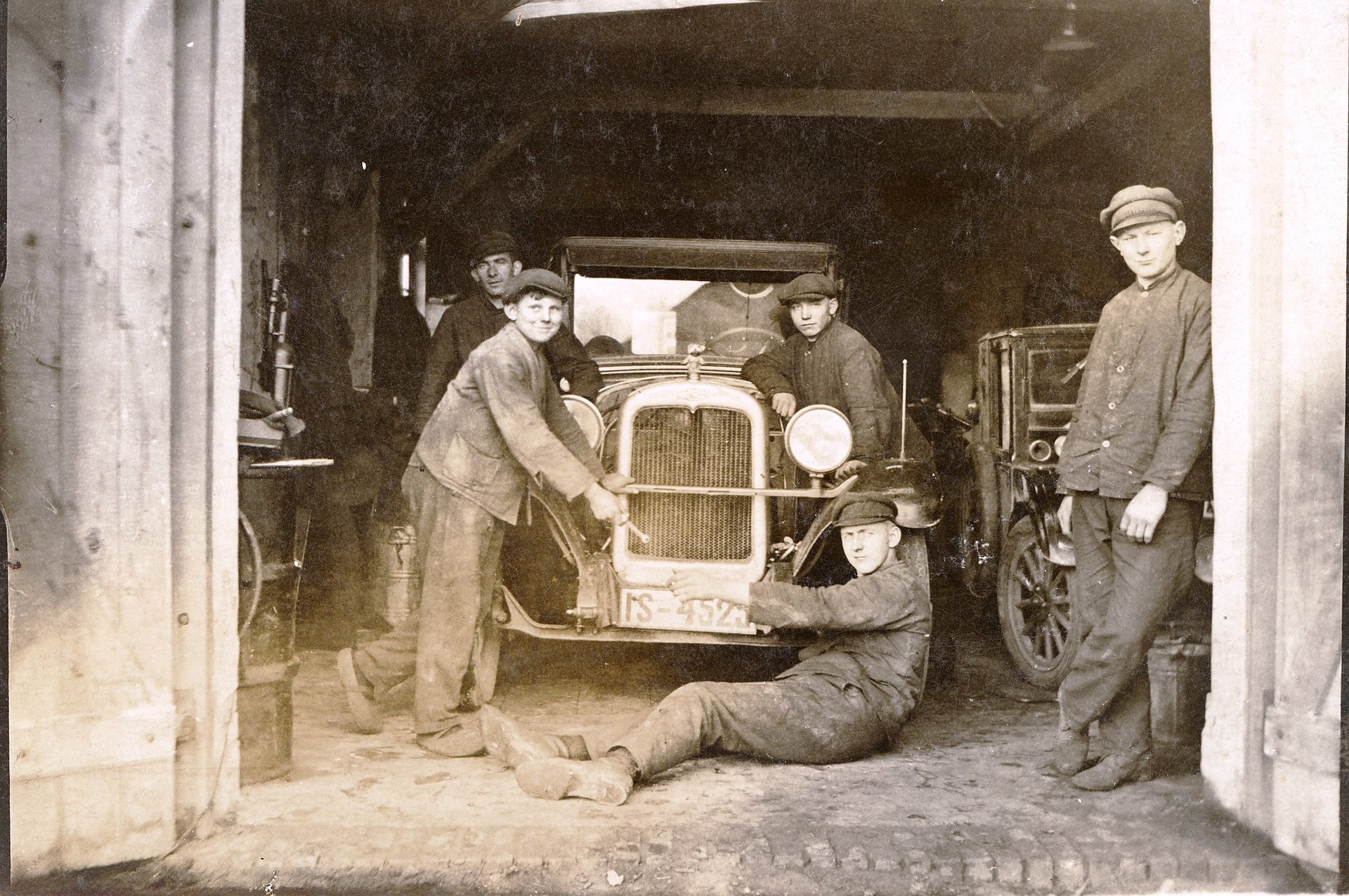 Schwarz weiß Foto mit Einblick in die erste Werkstatt. In einer Scheune stehen zwei alte Autos ein dem linken lehnen vier Monteure. Ein weiterer Monteur steht angelehnt in dem Tor.