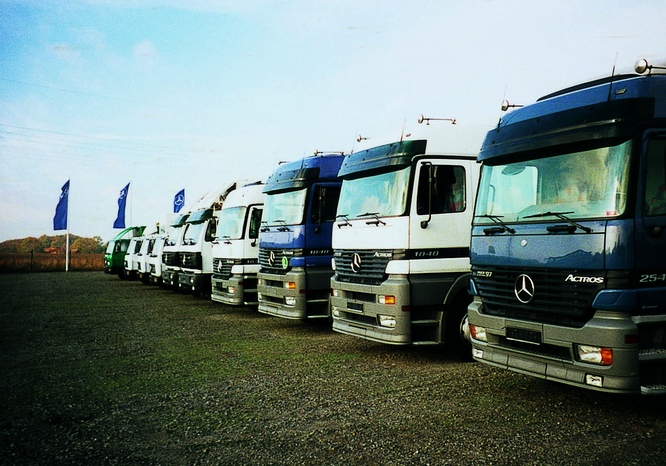 Bild unseres ehemaligen KFZ-Platzes dass zehn aufgereihte Mercedes LKW zeigt.